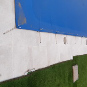 Amolado de pavimento, limpieza de superficie, preparación de perímetro, realización de medias cañas con mortero de fraguado rápido, sustitución de platos de ducha, sumideros y de albardilla de borde de piedra en vaso de piscina.